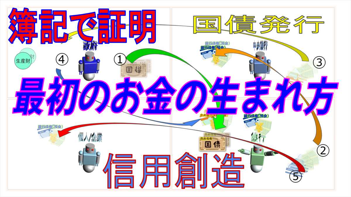 政府は政府債権である国債を発行し、銀行に売却します。銀行は国債を担保に銀行預金を創造します。銀行の信用創造により銀行債権である銀行預金が生まれます。銀行預金というお金の誕生です。この銀行預金はお金として流通し、取引などで使用されます。