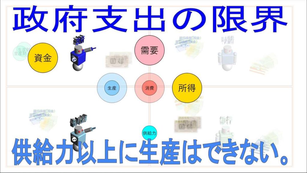 ただし、政府には資金調達の制限はありませんが、支出の制約はあります。政府が支出できるのは、供給力を超えない範囲ということになります。生産されないものを消費することはできないからです。