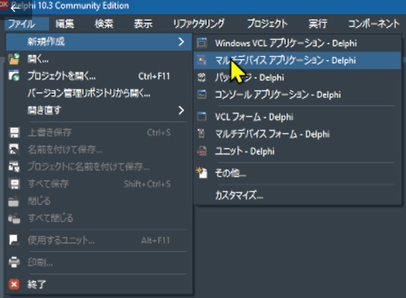 Delphiの初期画面からファイル ->新規作成 -> マルチデバイス アプリケーションを選択