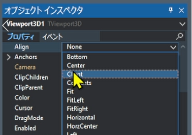 オブジェクトインスペクタからViewport3DのAlignプロパティ値をClientに設定してFormの大きさに拡大します。