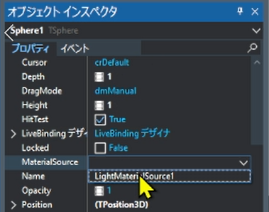 オブジェクトインスペクタからSphereプロパティのMaterialSourceを LightMaterialSource1に指定