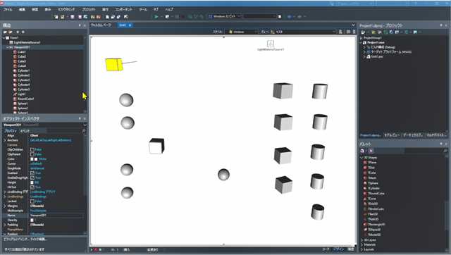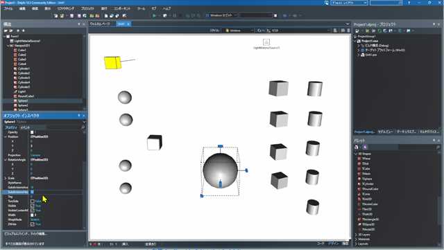 Sphere が立体表示されました。同様に以下のオブジェクトを配置し、プロパティを設定していきます。nameも変更しておきます。