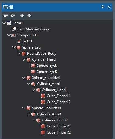(補足):足のプロパティ値を設定したら、胴体のプロパティ値を設定し、構造ウインドウで 胴体 を足の配下に移動して、次に頭のプロパティを設定してというように一つづつ設定したほうが分かりやすいかもしれません。