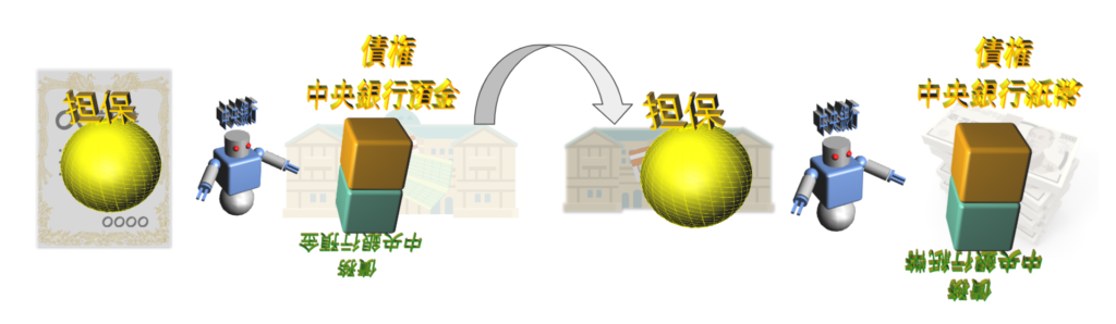 中央銀行は市中銀行が預け入れた債権等を担保に中央銀行預金を創造します。市中銀行が中央銀行紙幣を引き出す際には、その中央銀行預金を担保にして中央銀行紙幣を創造し、中央銀行紙幣を提供します。