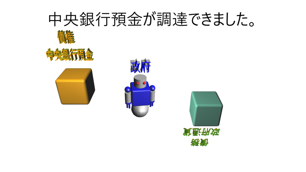 政府は中央銀行預金で資金が調達でき、予定の政府支出を行うことができるようになりました。また政府には負債が発生します。政府の債権としての借用証書である政府通貨が、債権である中央銀行預金に置き換わったことになります。債権・債務は均衡しています。